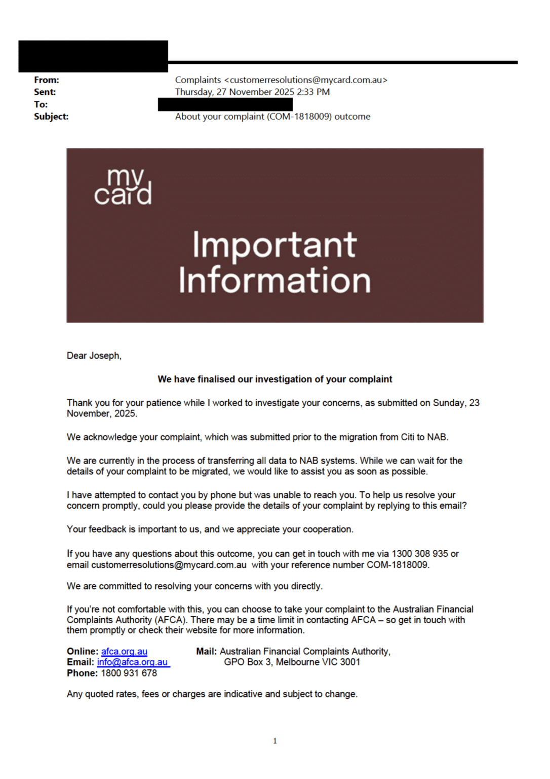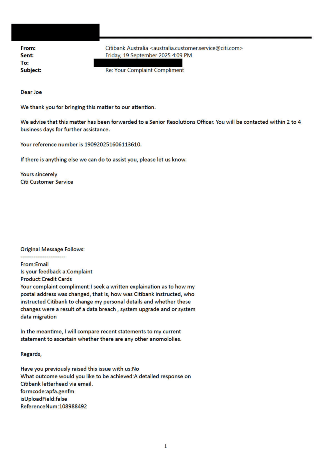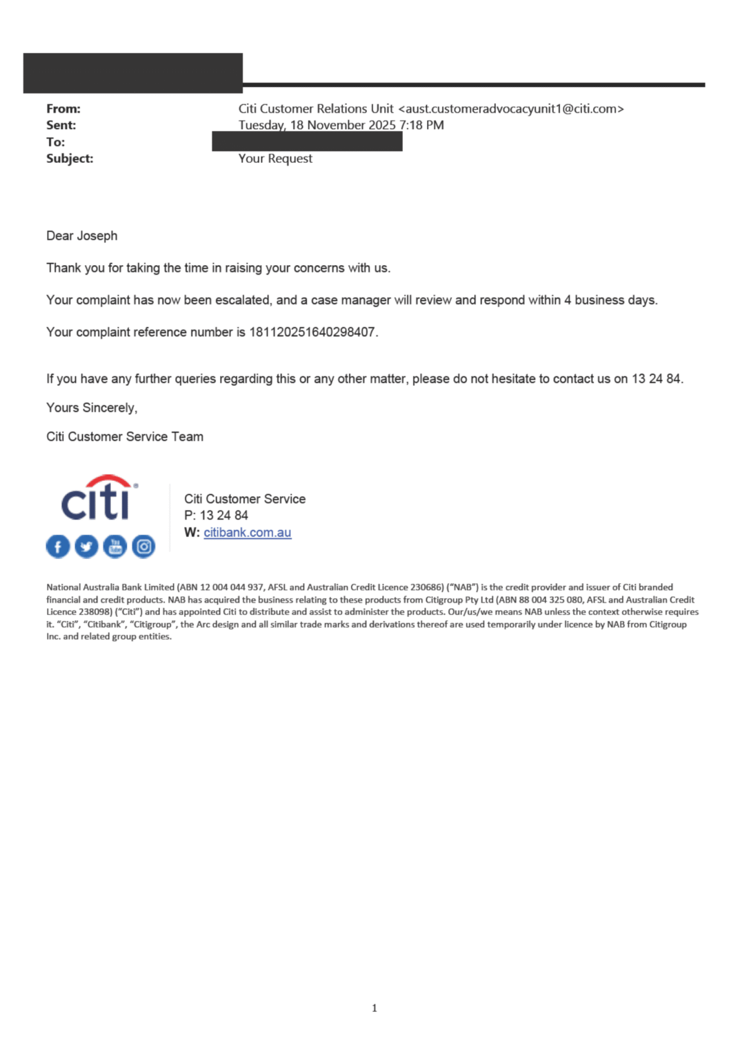 CITI Complaint (NAB-ID-01) – Email-001, dated 19 September 2025