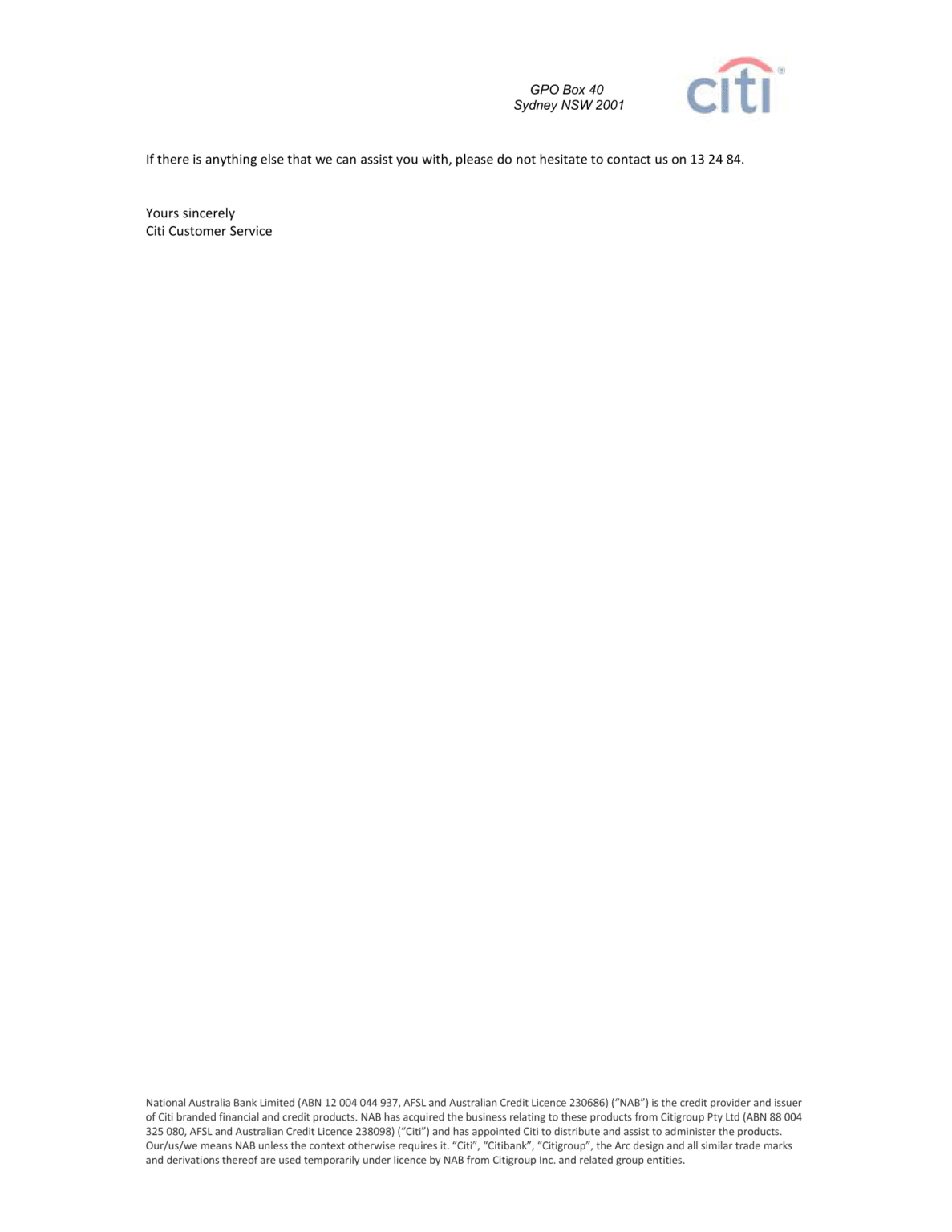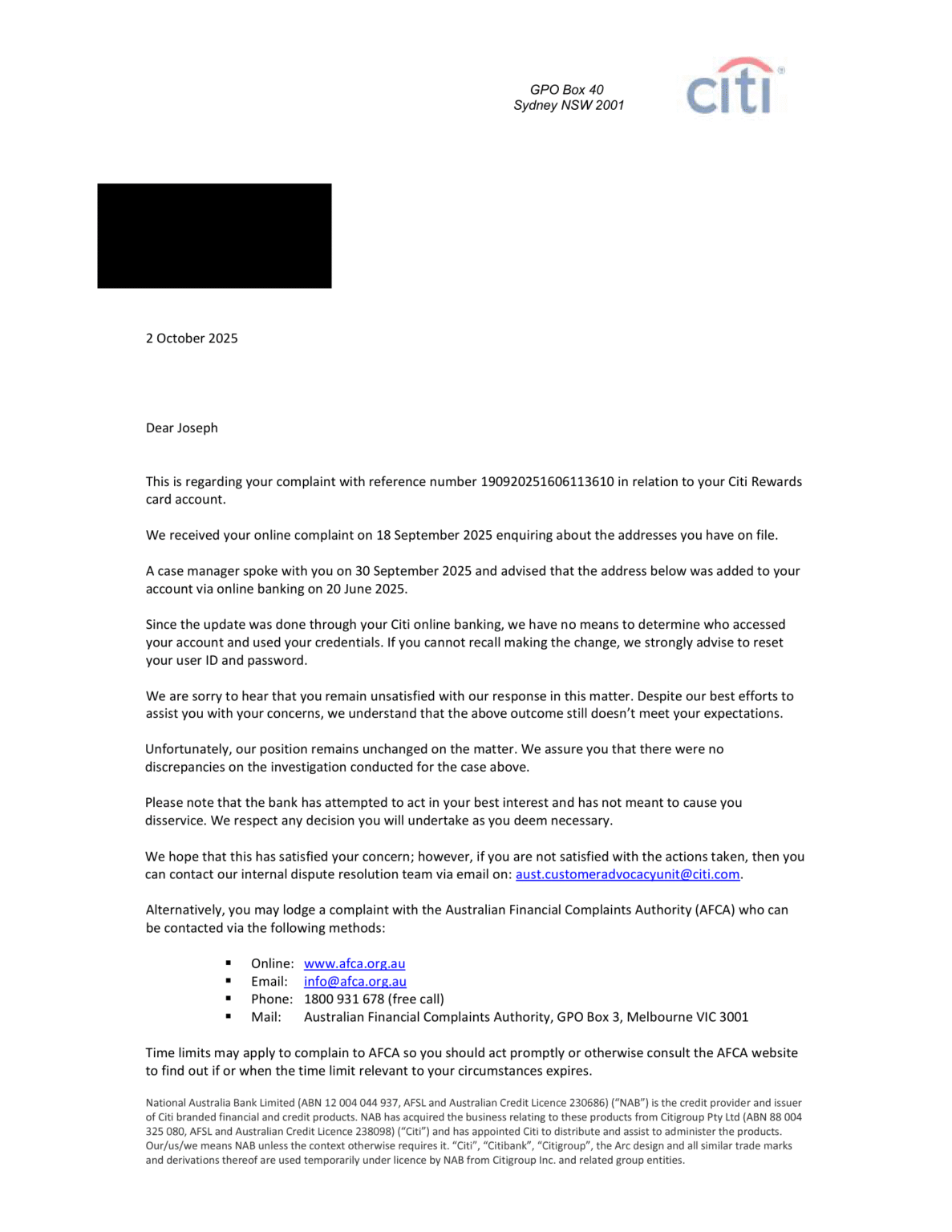 CITI Complaint (NAB-ID-01) – Letter-001, dated 2 October 2025