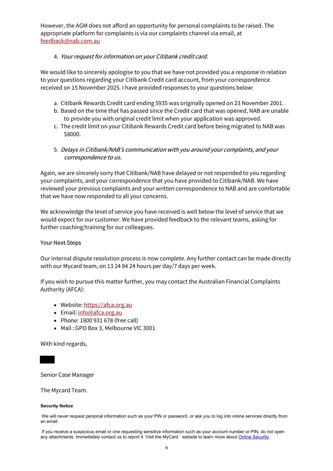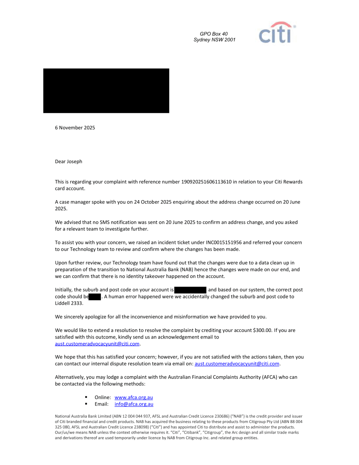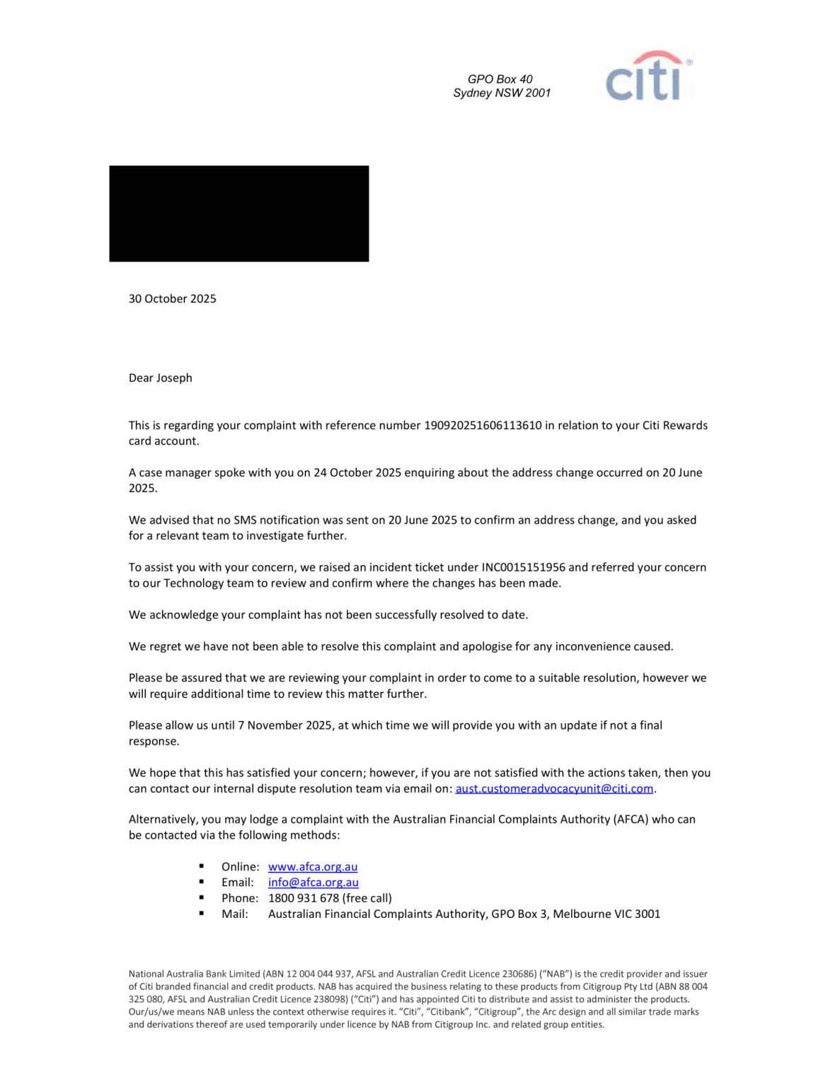CITI Complaint (NAB-ID-01) – Letter-004, dated 6 November 2025