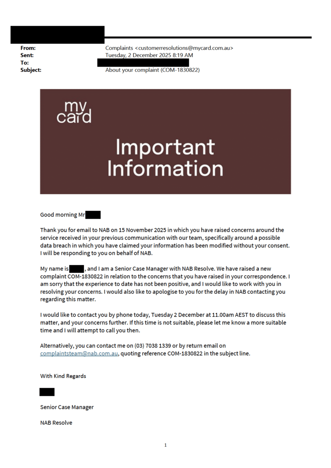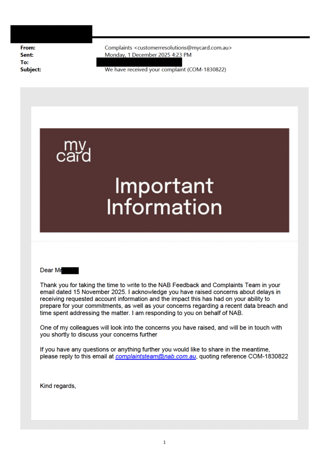 NAB Complaint (NAB-ID-06) – Email-001, dated 1 December 2025